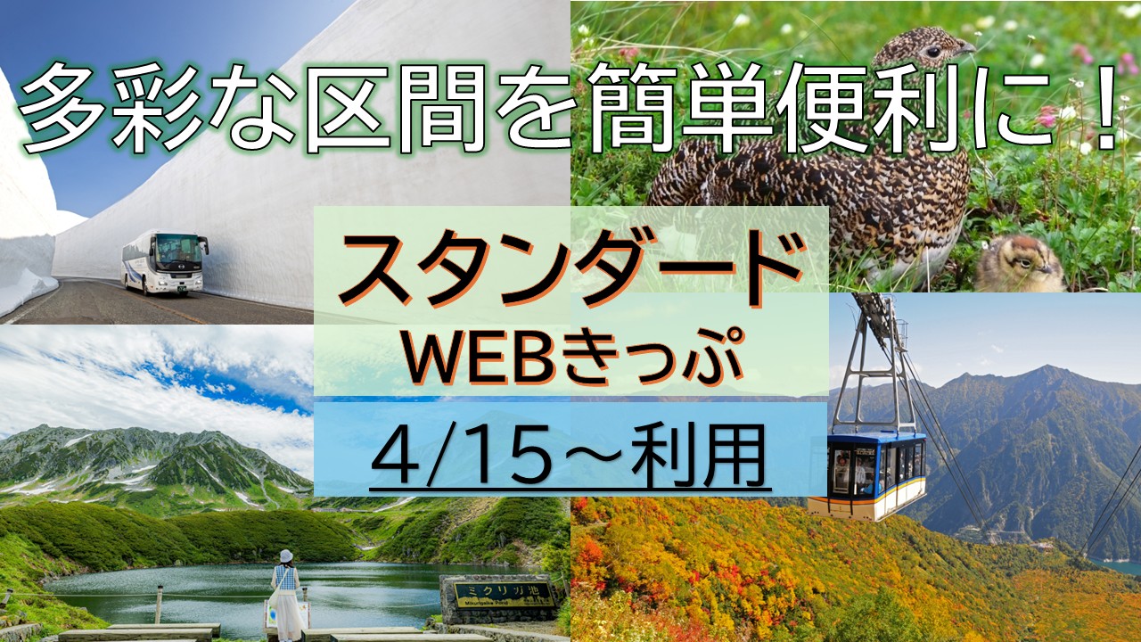 1.”スタンダードWEBきっぷ”とは? 立山駅発・扇沢駅発の乗車予約ができ、シーズン通じ多彩な区間を前日15:00まで購入できる、簡単便利なスタンダード商品です! また、扇沢駅~長野駅間を運行する特急バスや、扇沢駅~信濃大町駅間を運行する路線バスをご利用いただける、オプション利用券が追加購入できます。 2.販売スケジュール
